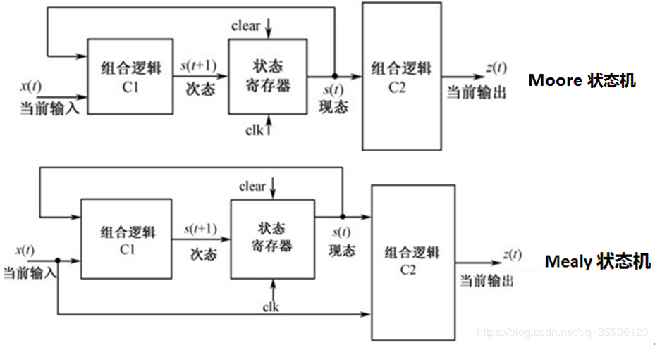 根据状态数目是否有限,状态机可以分为有限状态机和无限状态机;根据是否有一个公共的时钟控制,状态机可以分为同步状态机和异步状态机。其中,最常用的同步有限状态机又可以分为以下两种类型:Moore状态机和Mealy状态机。