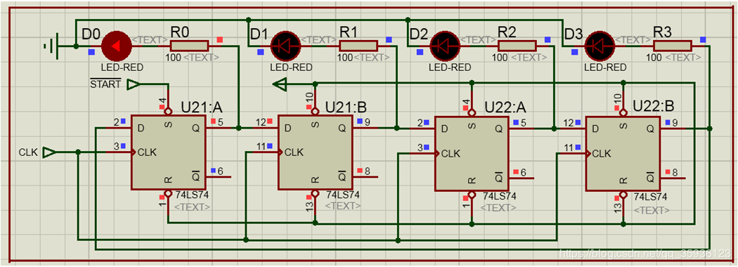 环形计数器是由D触发器构成的移位寄存器加上反馈电路闭环构成,四位环形计数器的电路如下图2所示:移位寄存器的低位触发器输出端接入相邻高位触发器输入端,而反馈电路从最高位触发器的串行输出端接入,其输出则连到最低位触发器的串行输入端。