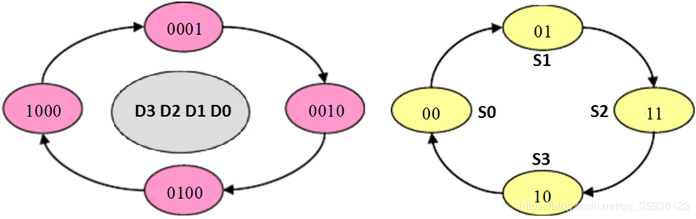环形计数器不能自启动,在开始运行前必须使能信号#START=0,使得环形计数器的四位触发器输出[D3, D2, D1, D0]的状态初始化为0001;然后,在时钟CLK驱动下,四位环形计数输出[D3, D2, D1, D0]按照以下顺序循环转换:0001→0010→0100→1000→0001→…如下图3(左)所示。环形计数器的特征是:n位环形计数器的状态数目N=n,而且其输出[D3, D2, D1, D0]是单热点(one hot)编码,即任何状态下只有一个Dx=1。所以,环形计数器的输出Dx即是状态的节拍信号,标志相应的状态。