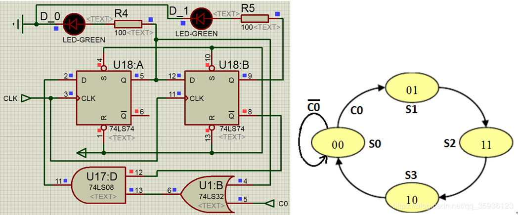 在上述扭环计数器构成的状态转移电路中,状态机的下一个状态(次态)仅由当前状态(现态)决定。在一些更复杂的时序系统中,状态机的次态不仅与现态有关,而且还与当前输入有关,例如下图5(右)所示的状态图中,当前状态S0时,若输入条件C0=0,状态机保持在状态S0;若输入条件C0=1,则在时钟clk的驱动下,状态机如常进行状态转移:S0→S1。该状态图对应的扭环计数器电路如下图5(左)所示,在反馈电路上增加了基于条件C0的判断逻辑。值得注意的是,条件C0只在状态S0有效,其它状态不起作用。