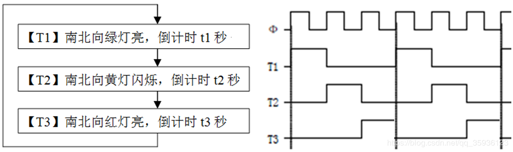图6所示是一个交通灯系统,展示如何运用状态机原理来设计时序系统。交通灯的状态机总共有T1、T2和T3三个状态,每个状态都有不同的亮灯模式和亮灯持续的时间(以倒计时的形式显示),如下图6(左)所示。该状态机没有输入,其状态转移仅仅取决于当前的状态。在时钟clk(φ)驱动下,状态机按照以下顺序循环转移:T1→T2→T3→T1→…,状态转移时序图如下图6(右)所示。