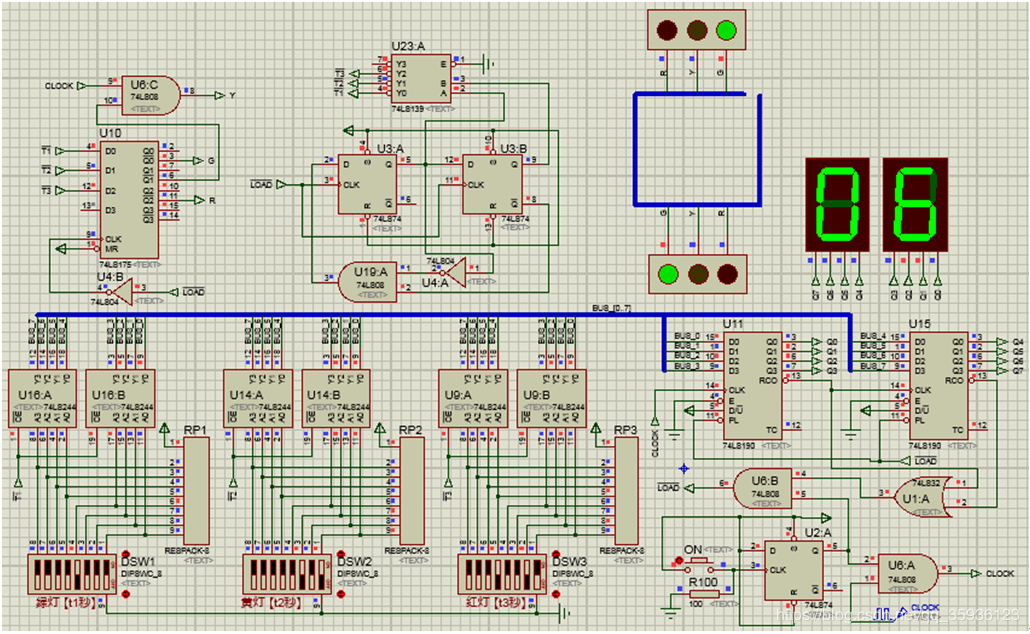 交通灯系统的电路如下图7所示:环形的路口上有南北向的两组红黄绿LED灯和一对数码管(显示倒计时),路口左边是整个系统的核心:时序发生器电路;路口下方是一个由BUS总线连接的计数器电路。在上图6(左)中,状态机在每个状态【Tx】中完成两个操作:LED灯亮和显示倒计时。时序发生器产生节拍{#T1, #T2, #T3},直接控制红黄绿交通灯;而计数器电路负责数码管的倒计时显示。