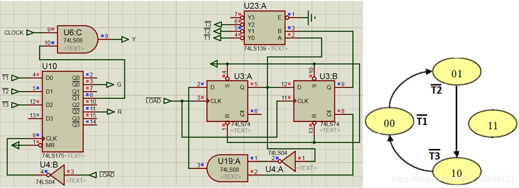 时序发生器电路如下图8(左)所示:右边的状态转移电路是由两个D触发器组成的2位扭环计数器,其反馈电路增加了限制:若扭环计数器当前状态输出端为01,则下一个状态输出端被强制修改为10,即跳过状态11。因此,扭环计数器输出经过2-4译码器后产生以下节拍序列{#T1, #T2, #T3}:{0,1,1}→{1,0,1}→{1,1,0}→{0,1,1}→…状态图则如下图8(右)所示。状态转移电路左边是一个基于寄存器74LS175的状态寄存器电路。当加载信号#LOAD=0时刻,其下降沿将把节拍序列{#T1, #T2, #T3}锁存,输出信号{R,Y,G}控制红黄绿交通灯:节拍 #T1和#T3分别反向生成信号G(绿灯亮)和R(红灯亮),节拍#T2则反向后和时钟信号CLOCK逻辑与生成信号Y(黄灯闪烁亮)。