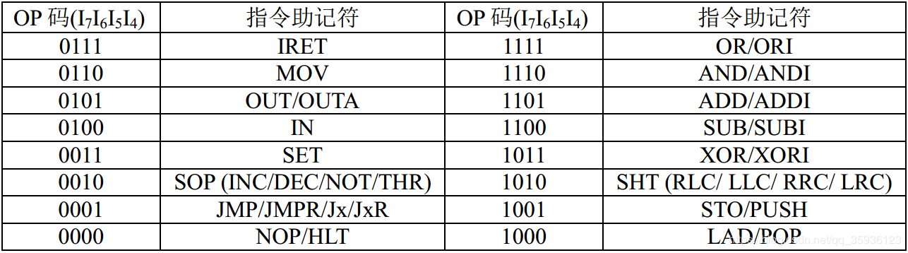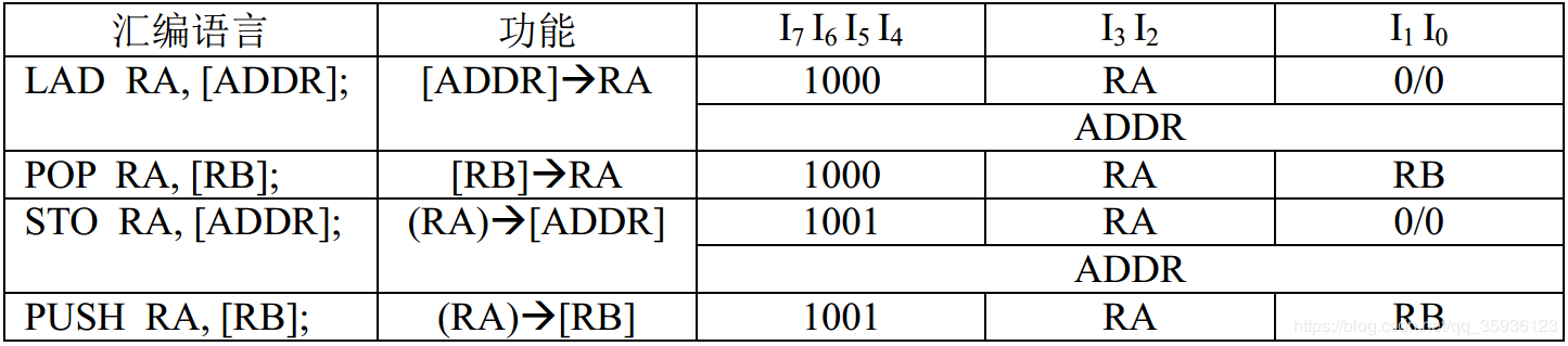 【注:因为LAD和POP指令共用OP码,STO和PUSH指令也共用OP码;所以共用OP码的指令间区别在于{I1,I0}位指定的内容。LAD和STO指令的{I1,I0}=00,故POP和PUSH指令的{I1,I0}≠00,即其指定的逻辑寄存器RB(指针)不能选择R0】