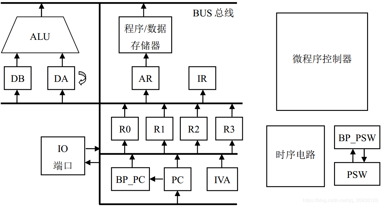 微程序CPU电路图1的架构如下图2所示,图2右侧是时序电路(CLOCK)和微程序控制器(CONTROLLER),左侧则是由8位系统总线BUS串联起来的数据通路,挂在总线BUS上的CPU部件包括:存储器ROM/RAM及其地址寄存器AR;指令寄存器IR;通用寄存器R0~R3;算术逻辑运算器ALU及其附属的缓存器DA(兼作移位功能)和DB;外设I/O接口;程序计数器PC及其断点寄存器(BP_PC);中断向量地址(IVA)。此外,数据通路还包括右边的运算结果标志位寄存器(PSW)及其断点寄存器(BP_PSW)。