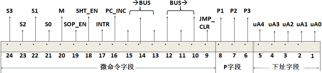 微程序CPU的微指令结构如下图3所示,微指令字长24位,其中1-5位是下一条微指令地址,即下址字段[uA4, uA0];6-8位是判断字段P1~P3;9-24位则是微命令字段,对应数据通路的所有微操作信号:其中置1的位表示执行相应的微操作;反之,置0的位则是不执行相应的微操作。