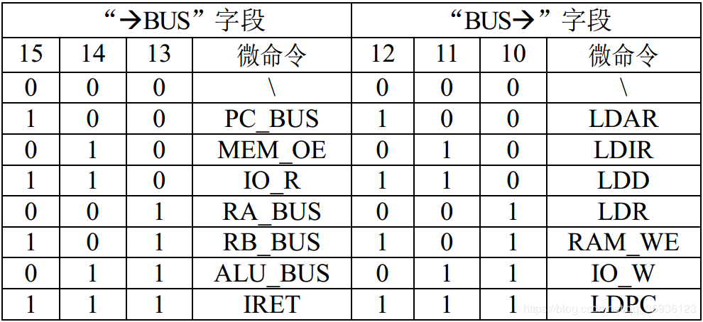 其中,微指令的15-13位和12-10位采用字段编译法(3-8译码),分别对应源部件输出到总线BUS和总线BUS打入目标部件的微操作信号,如下表2所示: