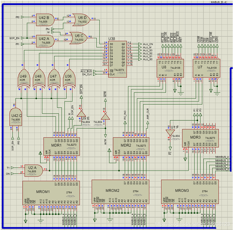 下图4中,微指令寄存器MDR2的输出端采用了两个3-8译码器74LS138进行字段译码,分别实现把数据从源部件输出到总线BUS(译码器U8)的微操作和从总线BUS打入目标部件(译码器U7)的微操作。因为,在任何一条微指令中仅有一条数据路径,该路径中只有一个源部件把数据打入总线BUS,其微操作信号互斥;也只有一个目标部件从总线BUS接收数据,其微操作信号也是互斥,因此,上述两种微操作信号可以分别用译码器实现。