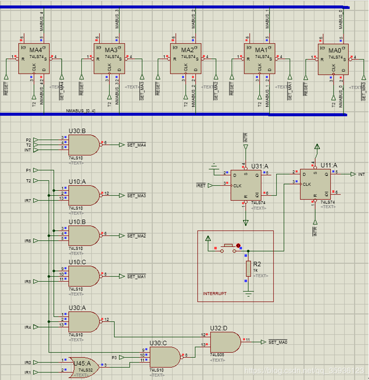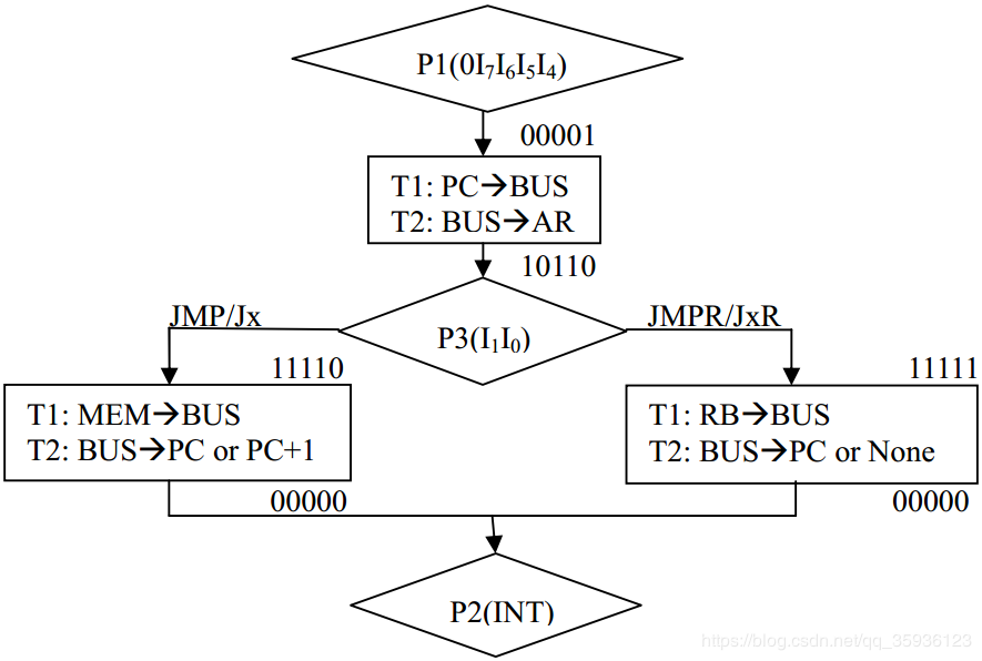 P2逻辑:若当前微指令是机器指令执行周期的最后一条微指令,则判断位P2=1;此时,若无中断发生,则返回取指周期第一条微指令地址[00000];若有中断发生(INT=1),则强制置位微地址寄存器的MA4,转向中断处理过程第一条微指令地址[10000]。