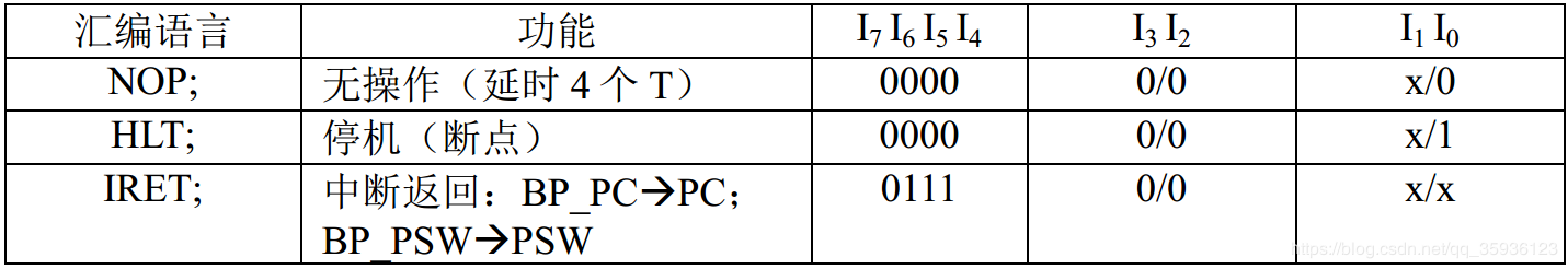 在上图6中,NOP指令主要用于精准延时(微程序/硬连线CPU延时4个T,流水线CPU延时1个T);而HLT指令用作程序末尾CPU停机或设置断点:程序自动运行到HLT指令时刻停机,可以观察当时CPU寄存器,运算器标志位等信息。IRET指令用于在中断处理子程序末尾返回主程序(即BP_PC保存的地址弹回PC,BP_PSW保存的标志位信息弹回PSW),因此,不允许在主程序使用IRET指令! 否则将导致程序错误跳转。上述三种单字节指令统称为系统指令,如下表4所示。