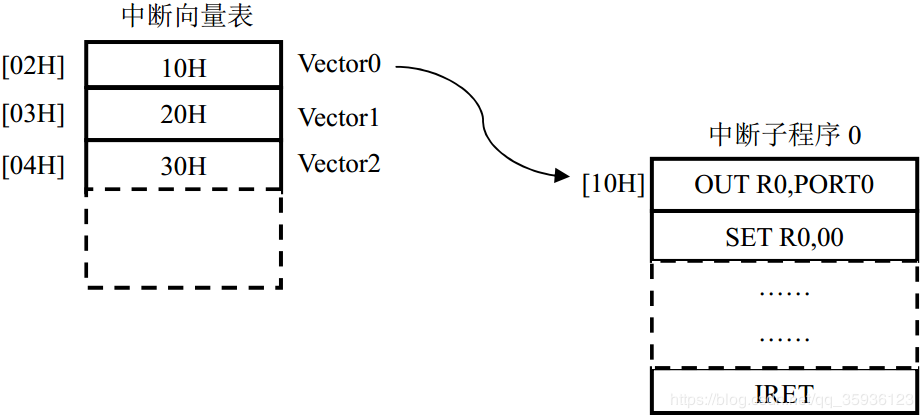 此外,微程序CPU的中断电路采用单级中断机制,不允许中断嵌套;同时,CPU采用中断向量表的形式保存中断向量Vector(即中断子程序入口地址)。如下图7所示,中断子程序的位置和长度随意设置,子程序的首地址(即中断向量Vector)必须放在中断向量表中。中断发生时,CPU通过二次寻址跳转到中断子程序执行。