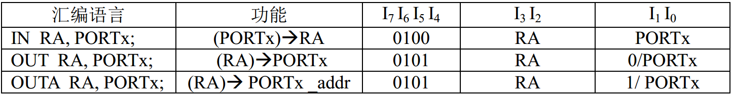 【注:IN指令可以选择{I1,I0}指定的四个输入端 PORT0-3中的一个; 而OUT/OUTA指令只能选择I0指定的两个输出端PORT0~1中的一个。】