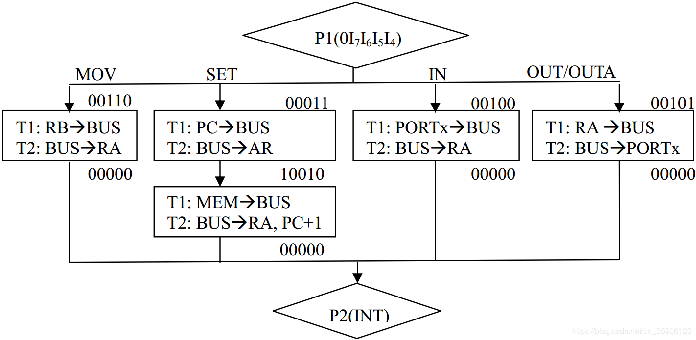 下图8是MOV、SET指令和IN、OUT/OUTA指令的微程序流程图,其中(P1判断前)取指周期和若有中断触发的(P2判断后)中断处理周期参见上图6。此外,OUT和OUTA指令的微指令序列完全相同,由硬件逻辑区分。