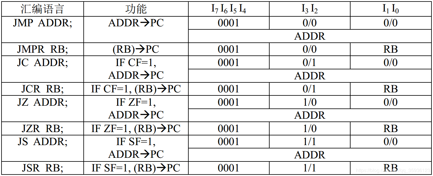 跳转系列指令共用OP码0001,指令{I3,I2}位规定是无条件跳转指令(JMP/JMPR)还是有条件跳转指令(Jx/JxR)其中一种;而指令{I1,I0}位则指定目标地址是来源于寄存器RB(单字节JMPR/JxR指令)还是来源于地址ADDR的存储器单元(双字节JMP/Jx指令)。