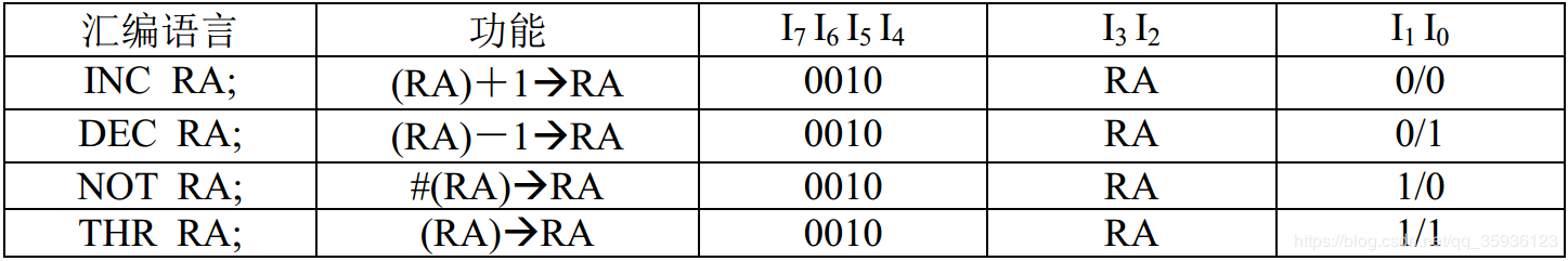 如下表10所示:单字节单操作数运算指令SOP可以把寄存器RA递增(INC)、递减(DEC)、取反(NOT)和直通(THR)。如下表所示,四个SOP指令共用OP码0010,由指令{I1,I0}位指定具体功能。