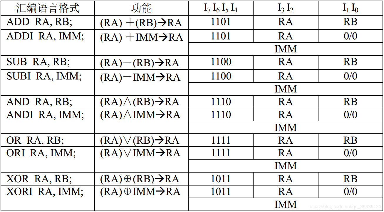 如下表11所示:双字节双操作数运算指令可以把两个操作数进行算术运算:加法(ADD)、减法(SUB),以及逻辑运算:与(AND)、或(OR)、异或(XOR)。指令的{I1,I0}位指定两个操作数全部来自寄存器或是操作数分别来源于寄存器和立即数IMM(指令第二字节)。前者是单字节指令(ADD、SUB、AND、OR、XOR),后者是双字节指令(ADDI、SUBI、ANDI、ORI、XORI)。