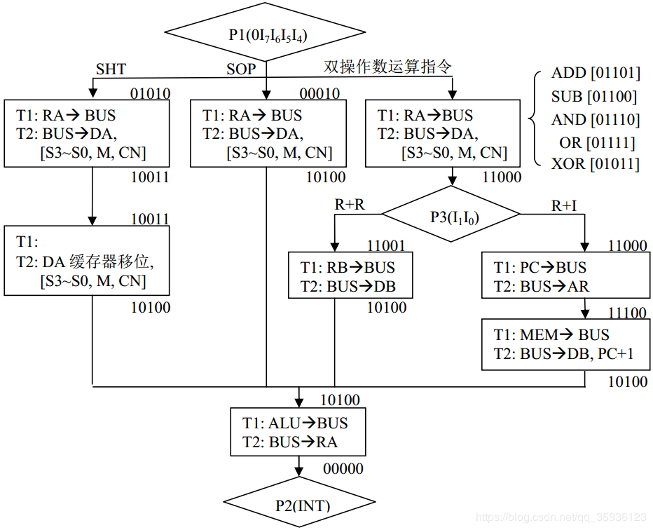 P3逻辑:在CPU指令集中部分单字节指令和双字节指令(LAD/POP、STO/PUSH、ALU系列和JMP系列指令)共用OP码,其执行周期的微指令序列共用第一条微指令(判断位P3=1),从第二条微指令开始分支,根据指令寄存器IR的I1I0位来决定不同微指令的分支走向:若{I1,I0}=00,微指令下址的MA0=0,操作数分别来自寄存器和存储器(双字节指令);若{I1,I0}≠00,则微指令下址的MA0=1,操作数全部来自寄存器(单字节指令)。