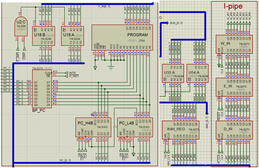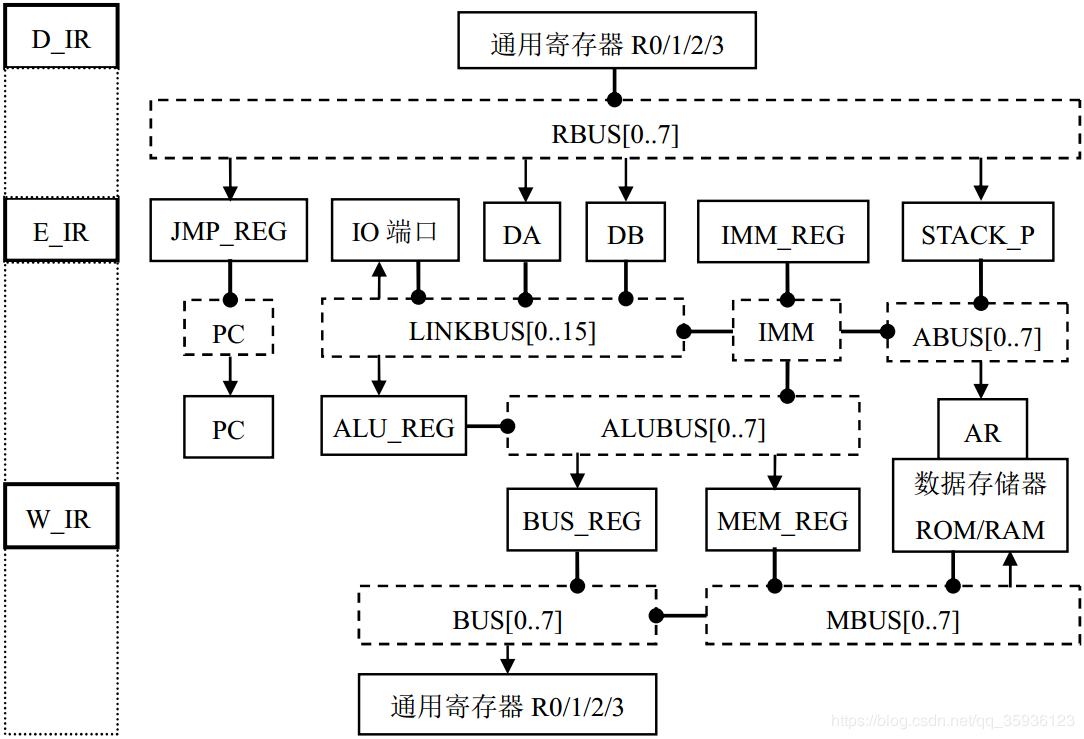 ②若F_IR总线上是双字节指令的第二字节立即数,则当指令第一字节I从D_IR推进到E_IR时(CLK上升沿),第二字节立即数 IMM从总线F_IR同时输出到指令寄存器D_IR和立即数寄存器IMM_REG,信号#IR_CLR立刻清零D_IR。