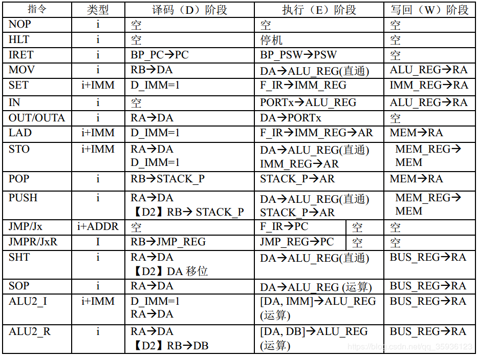 根据上述图4可以列出所有CPU指令在数据通路各段的RTL操作,如下表2所示。其中大部分指令是单字节指令“i”,亦有带立即数IMM和指令地址ADDR的双字节指令“i+IMM”和“i+ADDR”。此外,部分指令在某些阶段没有任何操作,即 “空”。