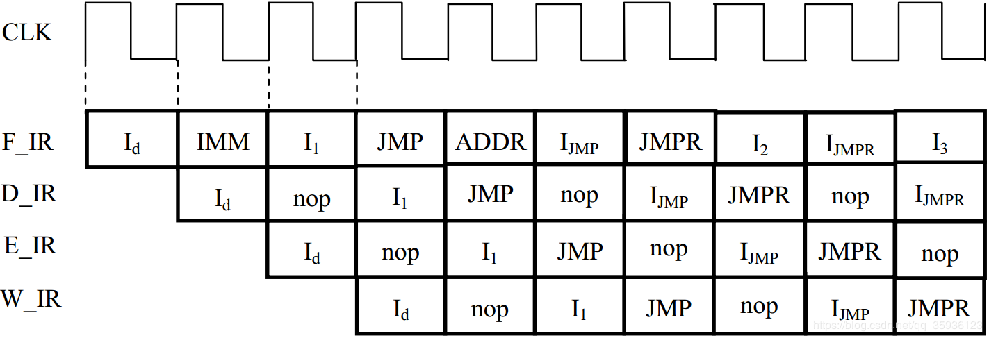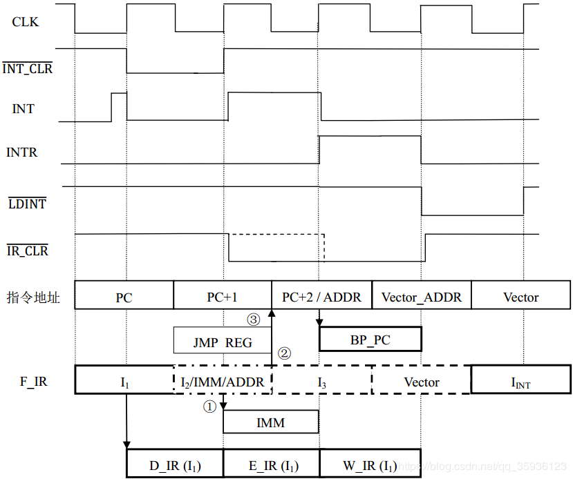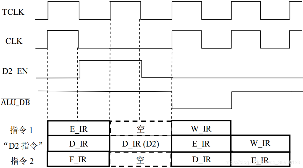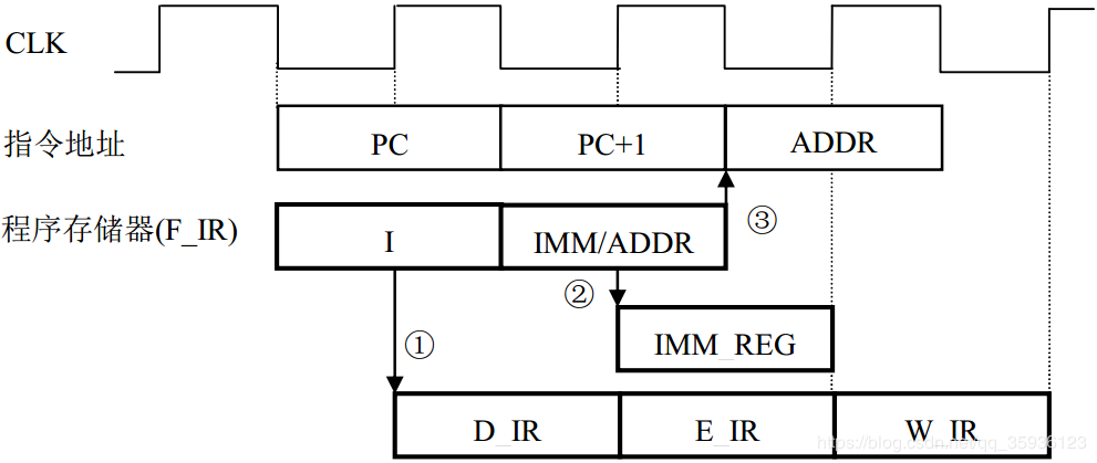 ① 若F_IR总线上是单字节指令或双字节指令第一字节I,则在下一个CLK周期的上升沿打入D_IR寄存器,并且在后续CLK周期的上升沿依次打入E_IR和W_IR寄存器。
