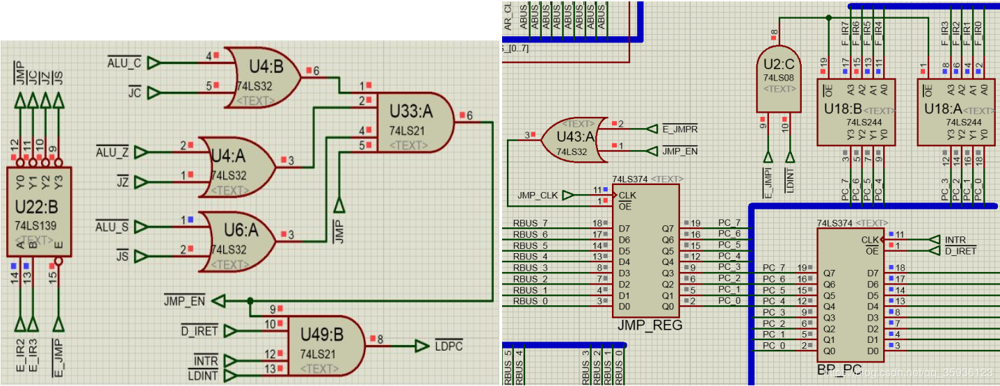 上述指令跳转路径的硬布线逻辑则如下图13(左)所示:指令信号JMP与E_IR寄存器的{I3,I2}位结合,得到无条件跳转指令信号JMP以及三种有条件跳转指令信号JC、JZ和JS。除了无条件跳转JMP指令会直接令信号#JMP_EN=0以外,其他三种有条件跳转指令信号JC、JZ和JS必须在对应的运算器的溢出标志CF、零标志ZF、符号位标志SF有效的情况下,才能触发#JMP_EN=0,进而使得程序计数器PC的加载端#LDPC=0有效。