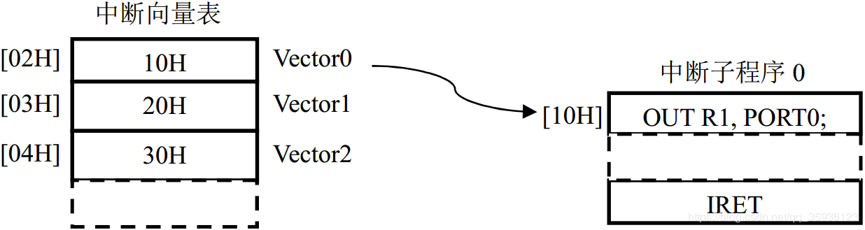 流水线CPU的中断机制与微程序/硬布线CPU保存一致,如下图18所示:采用单级中断机制,不允许中断嵌套,采用中断向量表保存中断向量Vector(中断子程序入口地址)。中断发生时,CPU通过中断向量表二次寻址跳转到中断子程序执行。