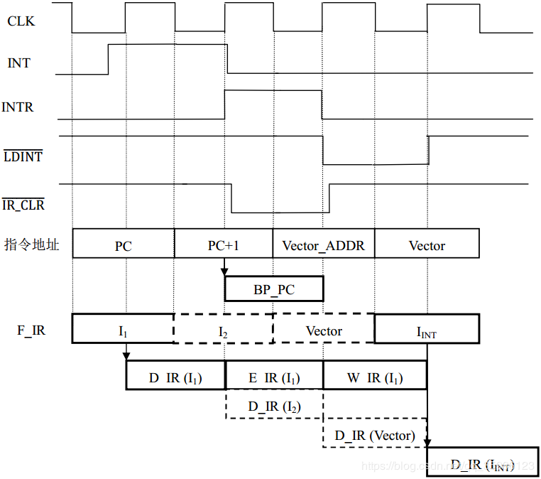 若不跳转,INTR上升沿打入BP_PC的断点是地址PC+2。信号#IR_CLR是持续一个CLK周期的低电平(如下图20中的虚线所绘)。根据前述气泡(bubble)机制把指令I3(PC+2对应的指令)清除,指令I1和I2都顺序经过流水线。
